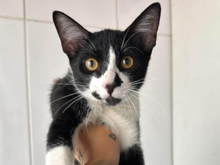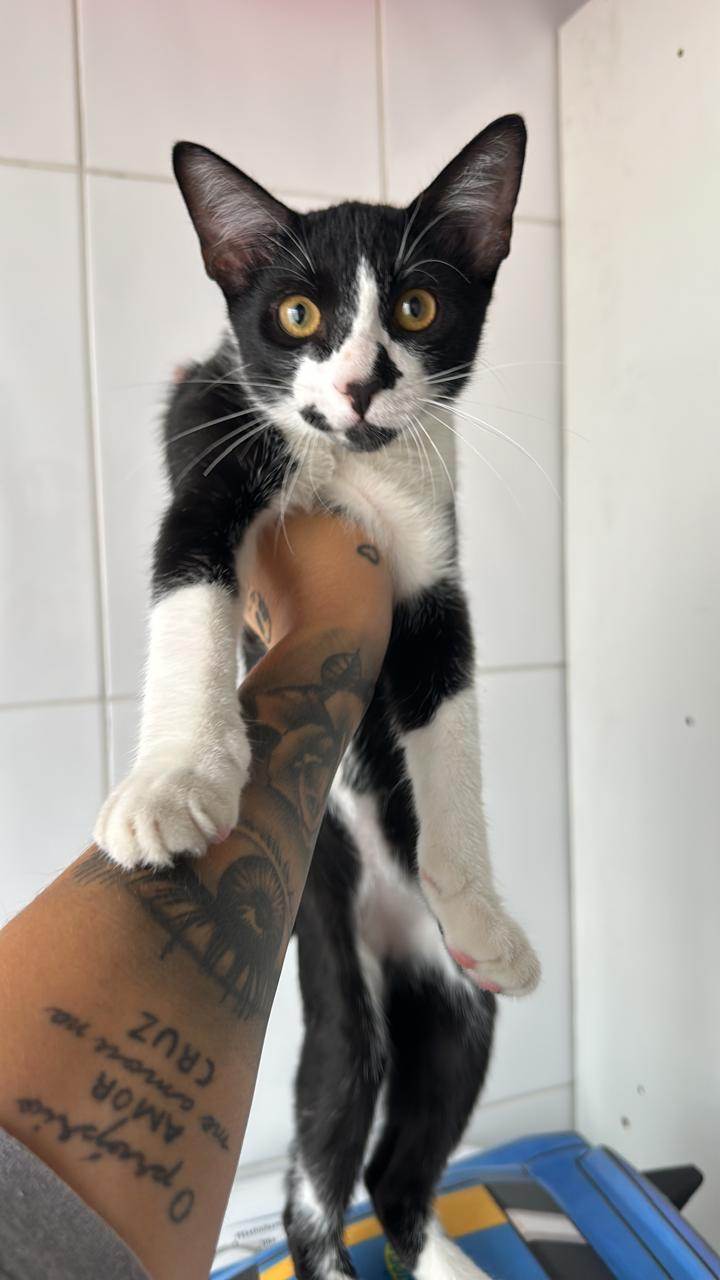 Gato médio, 1 ano, SRD-ViraLata, cor Branca/Preta.