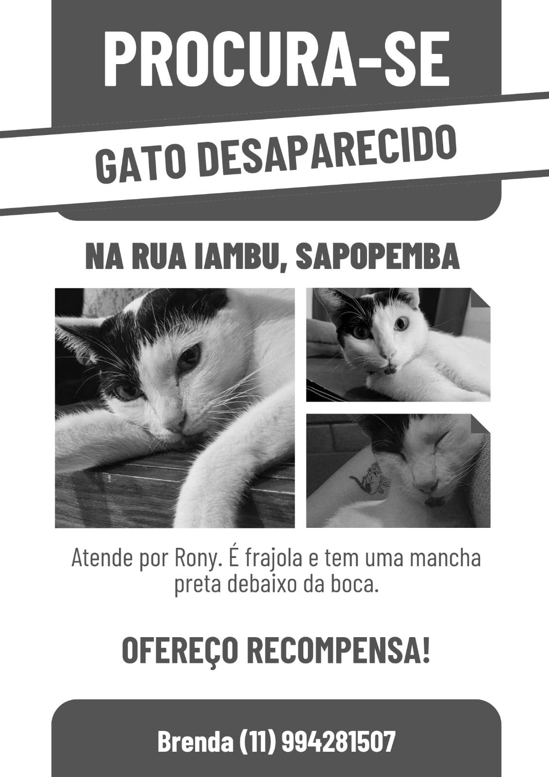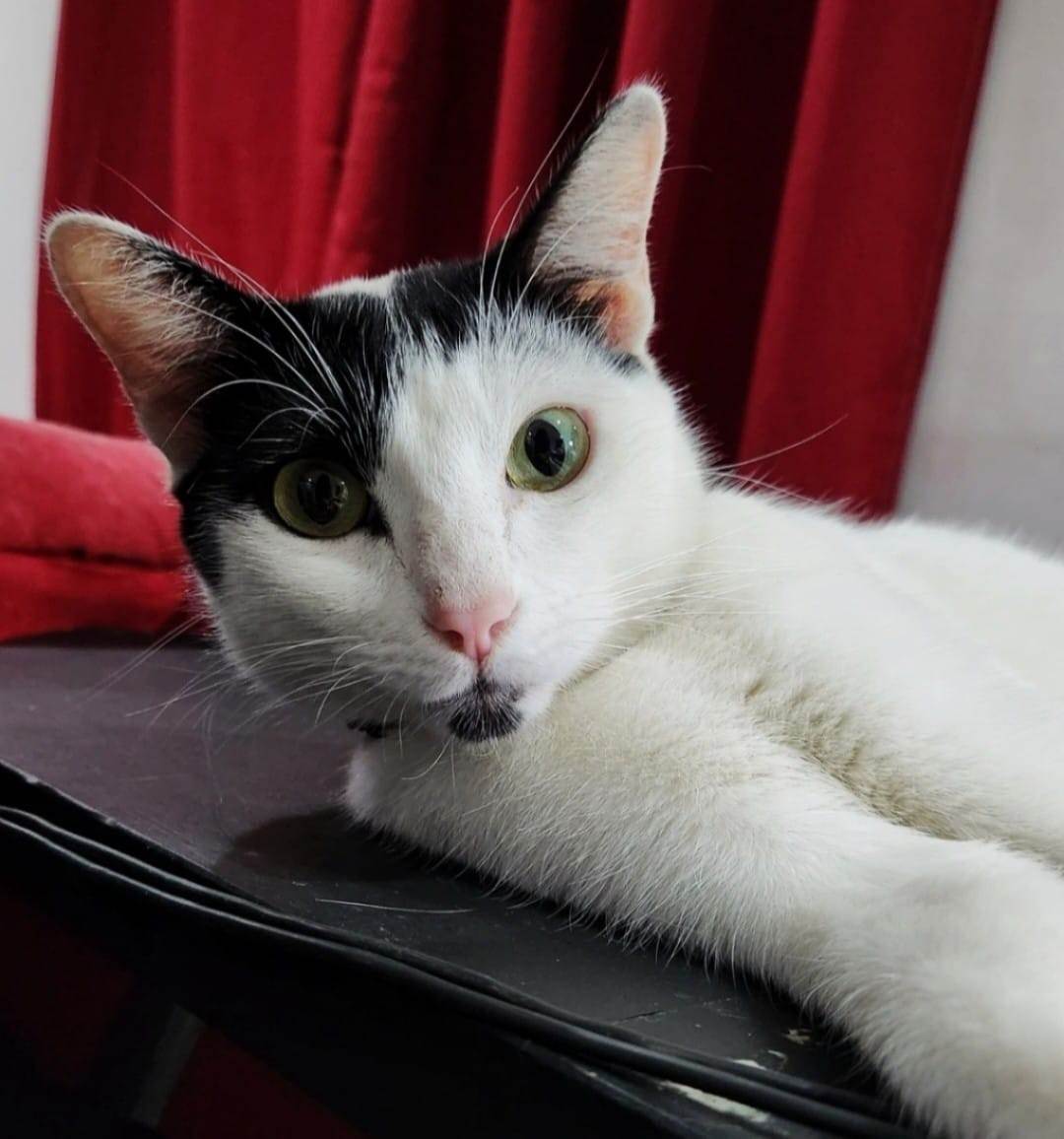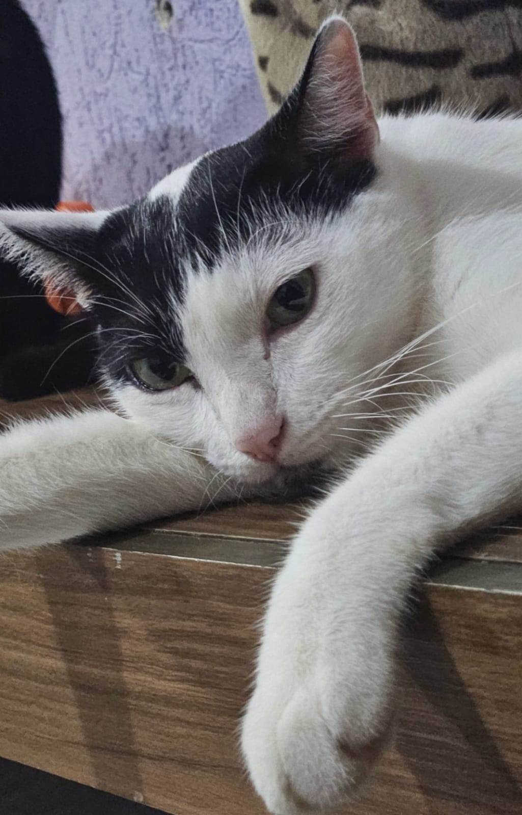 Gato macho com pelagem branca e marcas pretas na cabeça, rabo e parte frontal do pescoço. Olhos grandes e expressivos.Ele fugiu na rua Iambu, bairro Sapopemba, estação Jardim Planalto, ja faz 3 semanas e nao tivemos noticias,perto do escadão e numa rua próxima ao posto de saúde, se acharem mandem mensagem pra +55 11 99428-1507